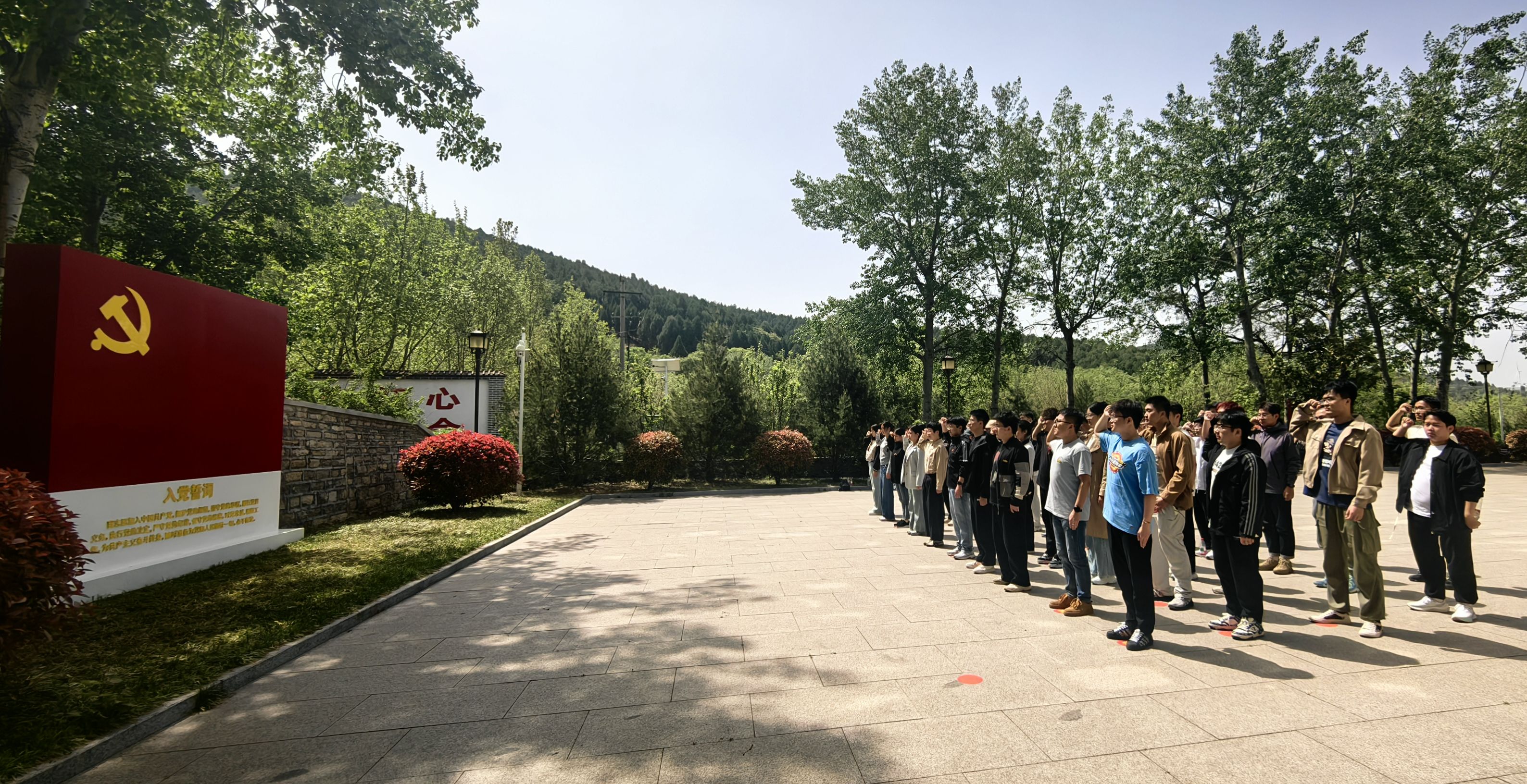 在鲜红的党旗前,全体党员庄严肃立,高举右拳,重温入党誓词,用铿锵有力的宣誓声表达对党的忠诚与为共产主义事业奋斗终身的决心。青春的誓言掷地有声,回荡在埋有革命先辈忠骨的青山之间,汇入中华优秀传统文化的底蕴之中,短促有力的誓词化作一条纽带,将个人理想与国家民族的命运紧密相连,这场跨越时空的对话诠释着“薪火相传”的深刻内涵。