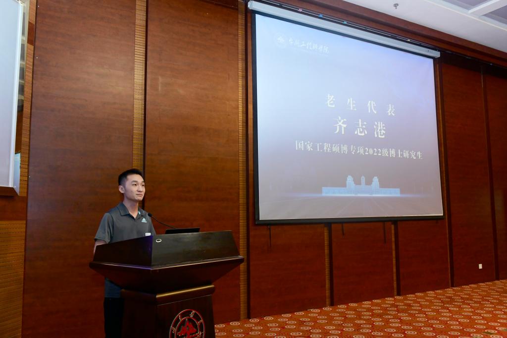 国家工程硕博专项2022级博士研究生齐志港代表老生发言。他结合自身经历,向新生介绍了学习体会和实践心得:要充分利用公司各类资源,夯基固本、学以致用;要用好入企实践的机会,培养动手能力;要珍惜各项有利政策,一心一意做科研,为壮大国家战略科技力量作出贡献。