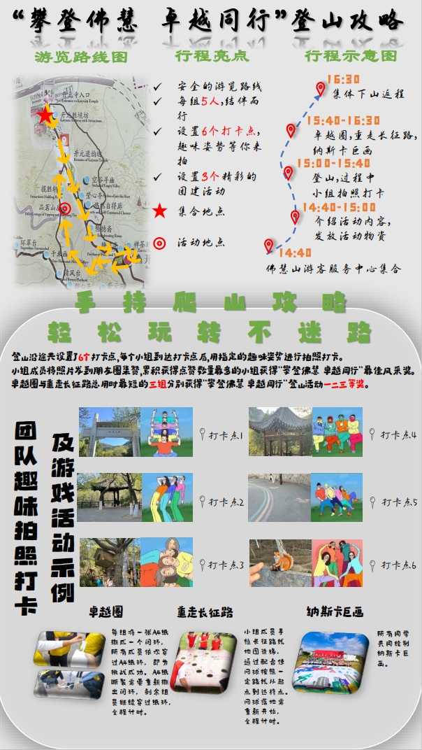 同学们分为五个小组,研究生院沈建霖老师、国卓院孙怡然老师作为“神秘嘉宾”加入员工小组助阵,共同完成游戏任务。在登山过程中,共设6个打卡点,同学们需按规定动作完成打卡,一路攀登,一路打卡,充分体验登山乐趣。
