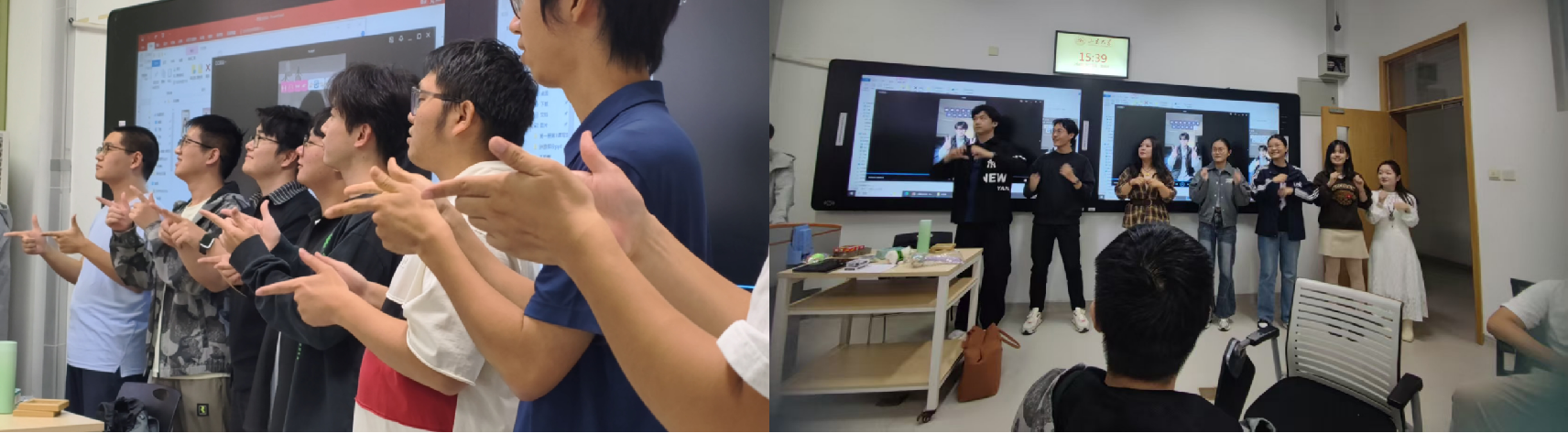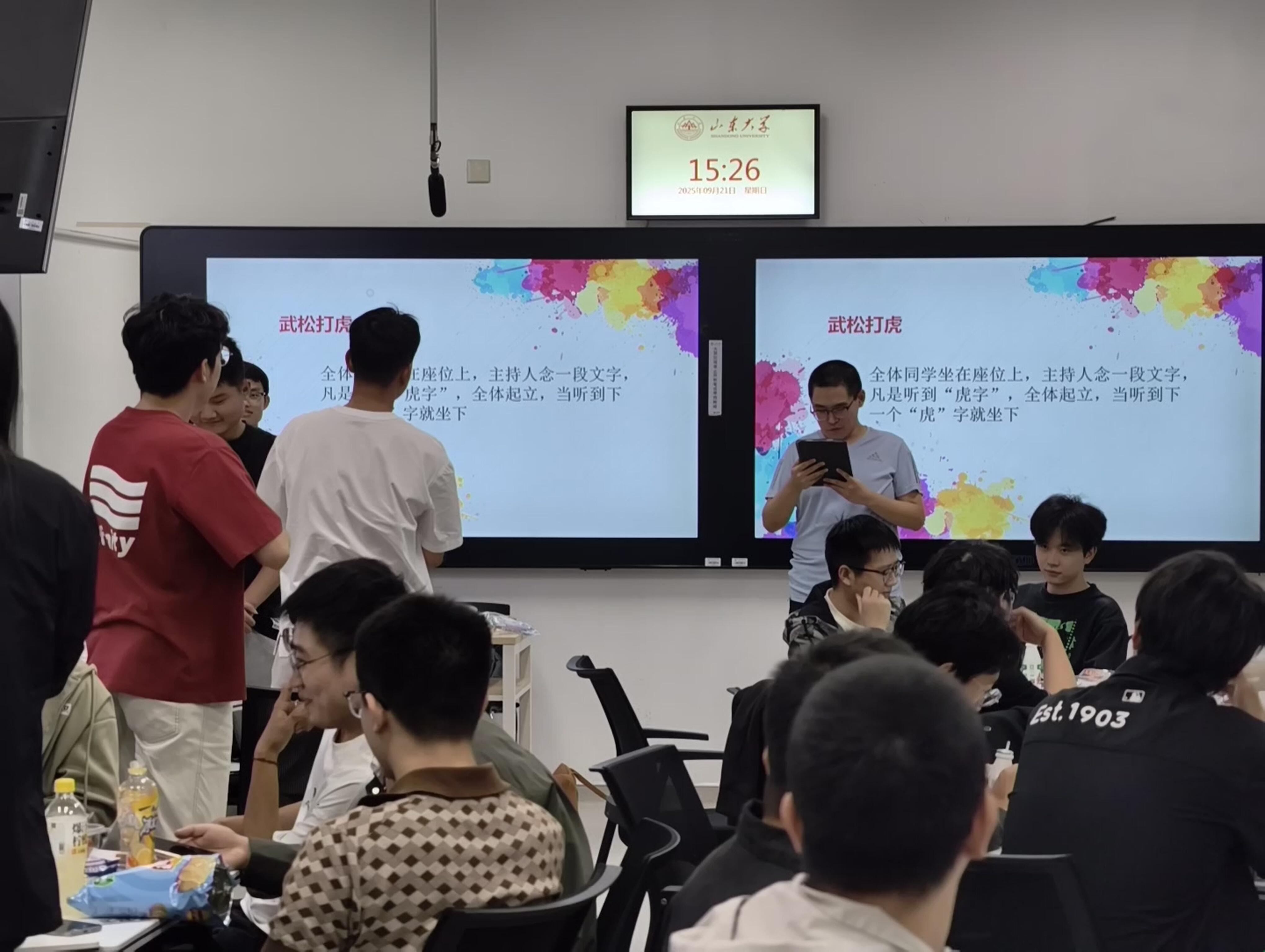在最受期待的游戏环节中,欢乐彻底“解冻”。同学们先后参与了“抓大小报名字”“逢7必过”“给点颜色看看”等考验反应与专注的小互动,不时有人“翻车”,在大家的善意笑声和小惩罚中更添热闹气氛。“数字炸弹”则让紧张与悬念叠加,谁会“踩雷”可谓全场焦点;“武松打虎”则让同学们在起立与坐下之间手忙脚乱,欢乐此起彼伏;“剪刀石头布接龙”更是点燃了全场氛围,对决紧张、团队逐渐壮大,最后所有人汇聚成“一条长龙”,笑声与掌声交织在一起。所有在游戏中“不幸”失败的同学,都接受了一起跳手势舞的“惩罚”。这个环节非但没有让大家感到尴尬,反而成为全场最欢乐的时刻之一,大家一起笨拙又可爱的舞姿,定格了许多珍贵而美好的瞬间。