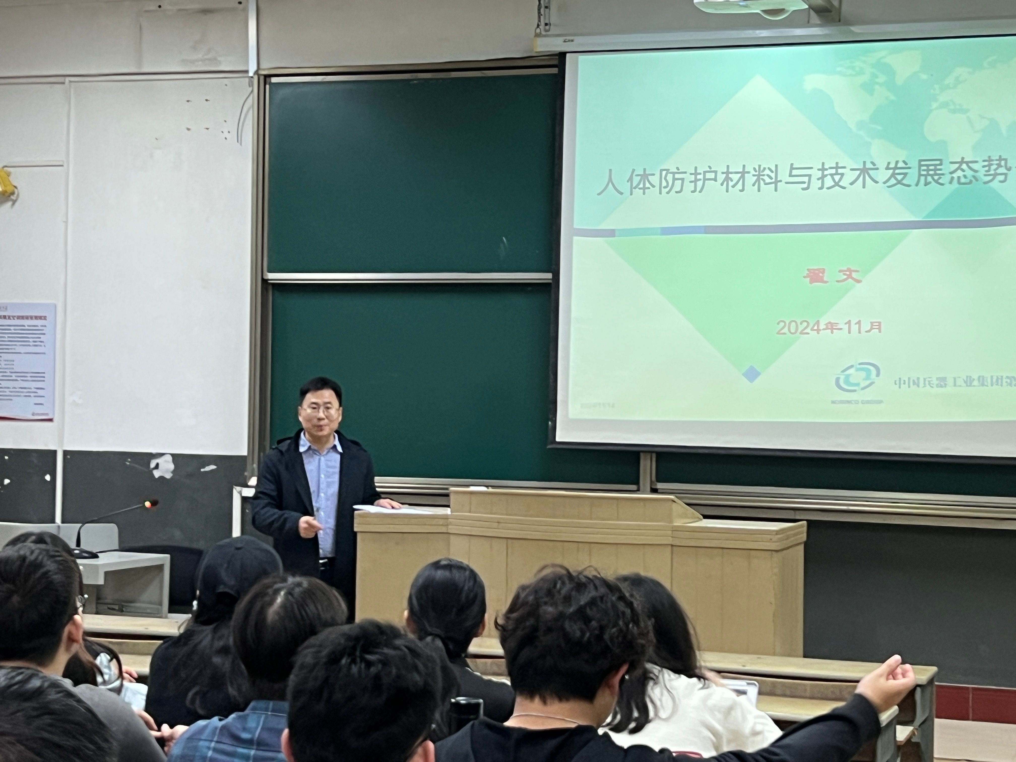 讲座伊始,翟文从“战争的最终胜利靠的是什么?”“社会维稳靠的是什么?”两个问题入手,对现场同学进行启发,并指出先进的国防建设必须要有高端的人体防护装备,好的防护装备必须要有先进的防护技术,并从人体防护技术的重要性、内涵以及防护装备的防护标准等方面,分析了纤维力学性能与抗弹性能之间的关系,探讨了人体防护材料的抗弹吸能机理、设计制造工艺技术及其应用现状,最后对高性能有机纤维在防弹复合材料领域的发展趋势进行了展望。